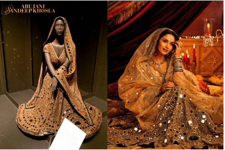 Fortunately for us, the costume (or at least versions of it) has also popped up in a few different places: after being used for the film, the costume was displayed at the Victoria & Albert Museum as part of the Fabrics of India exhibition in 2015. You can see from the image on the left that the while the ghagra (skirt) appears to be the same or very similar to the one worn by Dixit, the choli (blouse) or dupatta/odhni (veil) appear to be different. The choli worn by Dixit appears to have a scoop neck, whilst the one on display at the V&A has a v-neck.