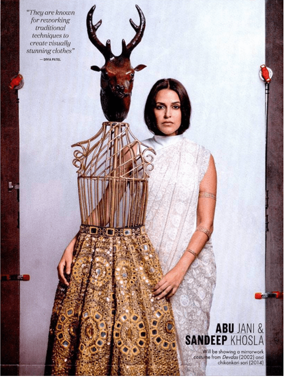 Jani and Khosla created their first couture mirror ensemble in 1989. Twelve years later, came this gharara hand-embroidered with real mirrors and zardozi work, which was worn by Madhuri Dixit-Nene in Sanjay Leela Bhansali’s onscreen saga Devdas. A movie for which the duo received the National Award for Costume Design as well. The flared 10-kilo, 10-panel ghagra took a team of 50 highly- skilled artisans two months to make, becoming the most talked-about piece from the repertoire created for the film. Ironically it didn’t eventually feature in the movie but was part of the ‘The Fabric of India’ exhibit at the Victoria & Albert Museum, London, in 2015. “Embroideries from Gujarat have always fascinated us—we work on both thread and mirrorwork techniques from the state. We love reinventing traditional mirrorwork, which is quintessentially folksy, transforming it into fabulous couture,” they say.”