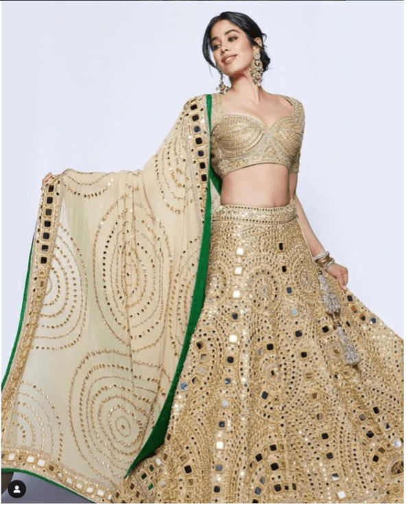 Actress Jhanvi Kapoor also wore a version of this costume for a wedding in 2021. Again, the ghagra appears to be similar to the original, but the waistband is different with a gold base and smaller mirrors than the version displayed at the V&A (and possibly the film version).