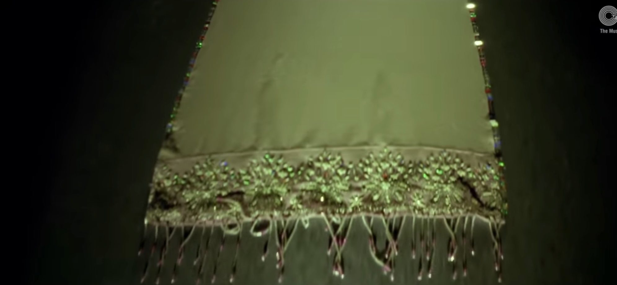 The dupatta is in a relatively narrow width (probably because it’s designed more as a prop than for coverage), and features a simple sequin border in AB sequins on the two longer sides. The ends have a wider embellished border which looks like it was embroidered separately and then appliquéd on, with beaded fringe finishing it off.