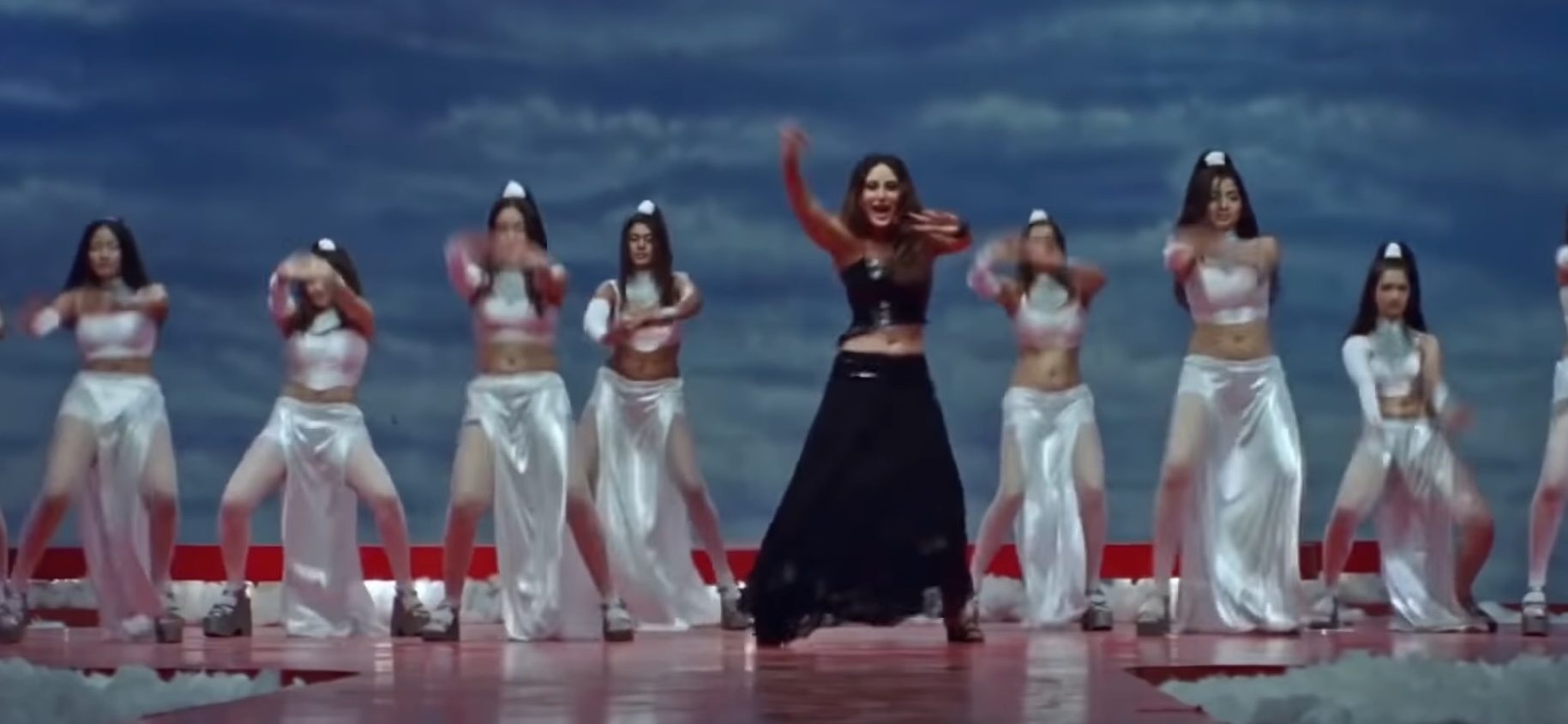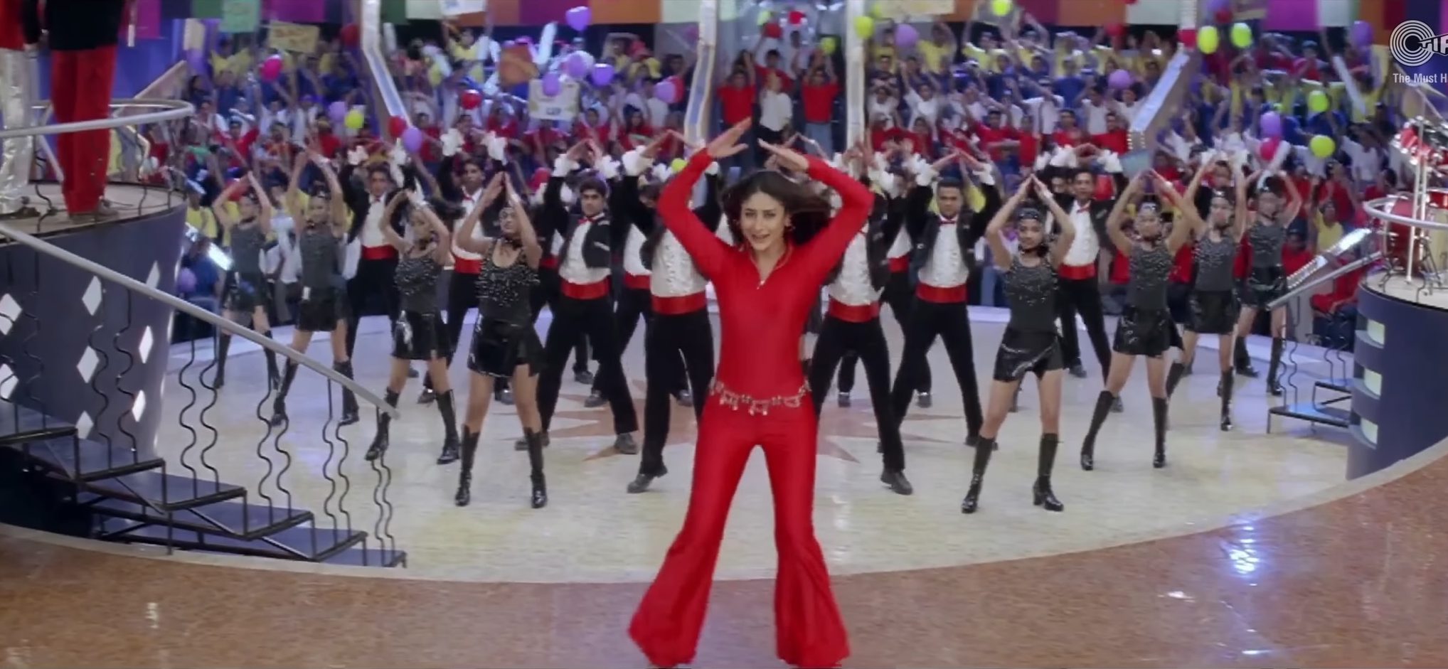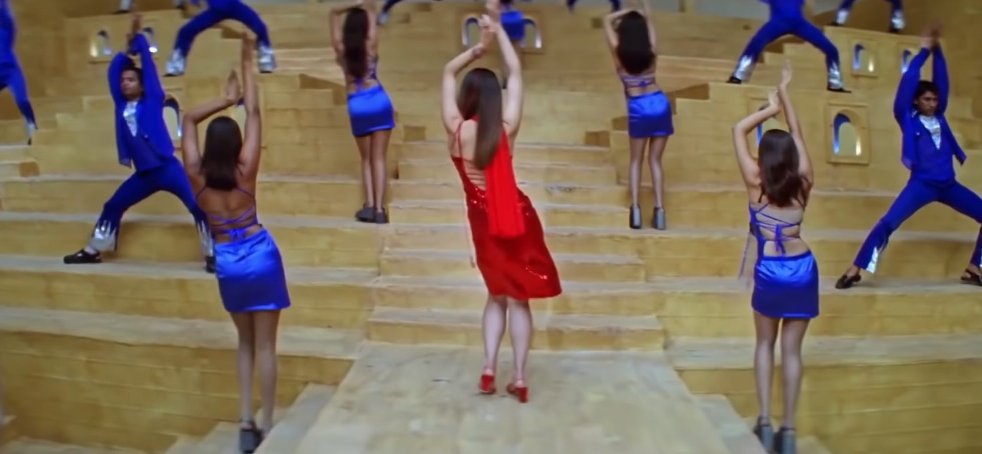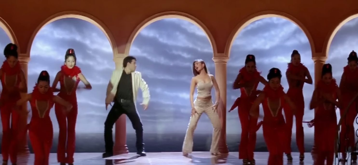 If you’re wondering how much influence Britney Spears had in the early 2000s, look no further than Kareena’s next outfit in this song which is a red spandex jumpsuit. It’s not a direct copy, but we’d say significantly inspired by the original in Oops I Did It Again. The jumpsuit features a high neck embellished with red sequins and zip front opening. The legs are flared and the sleeves are finished in pointed ends. The back is open with a series of straps across. Where’s the dupatta? Good question…