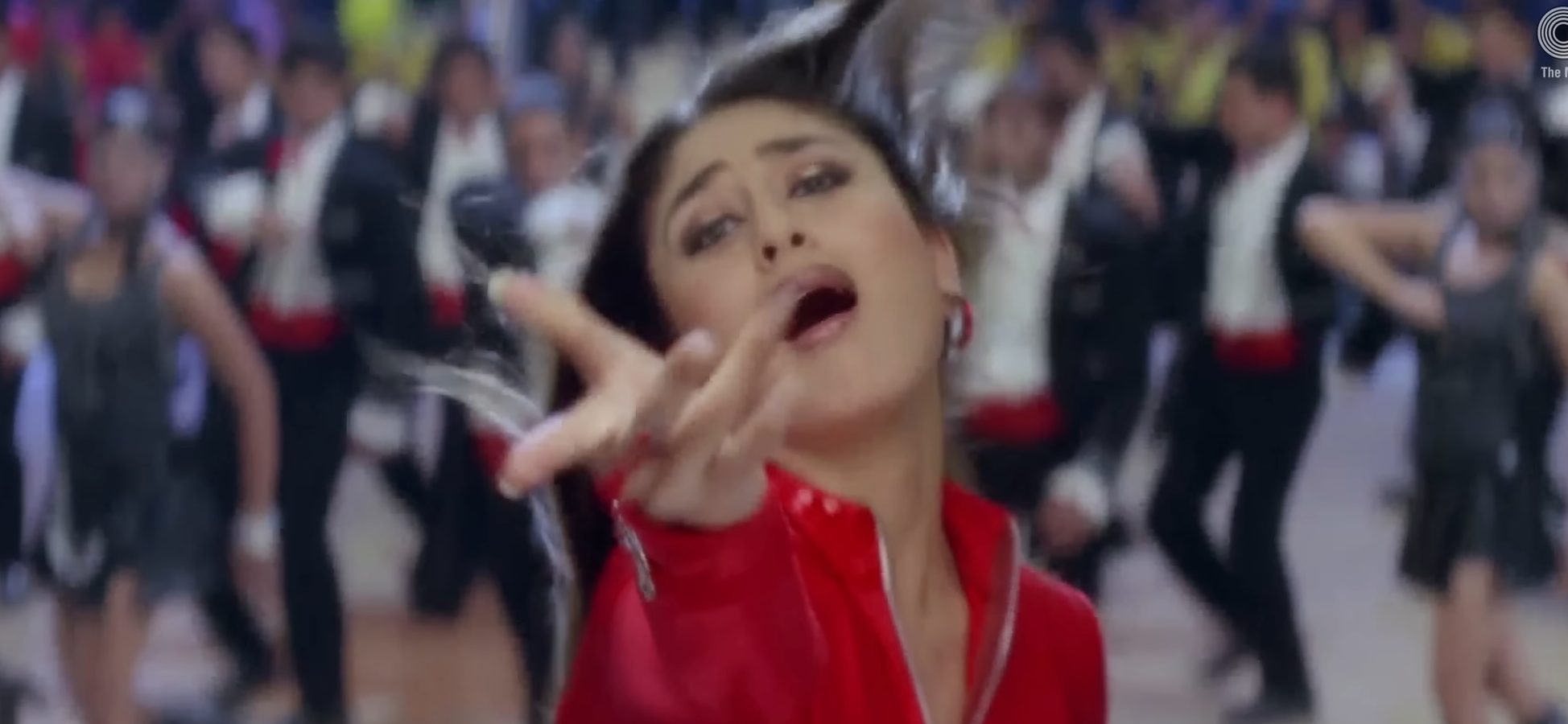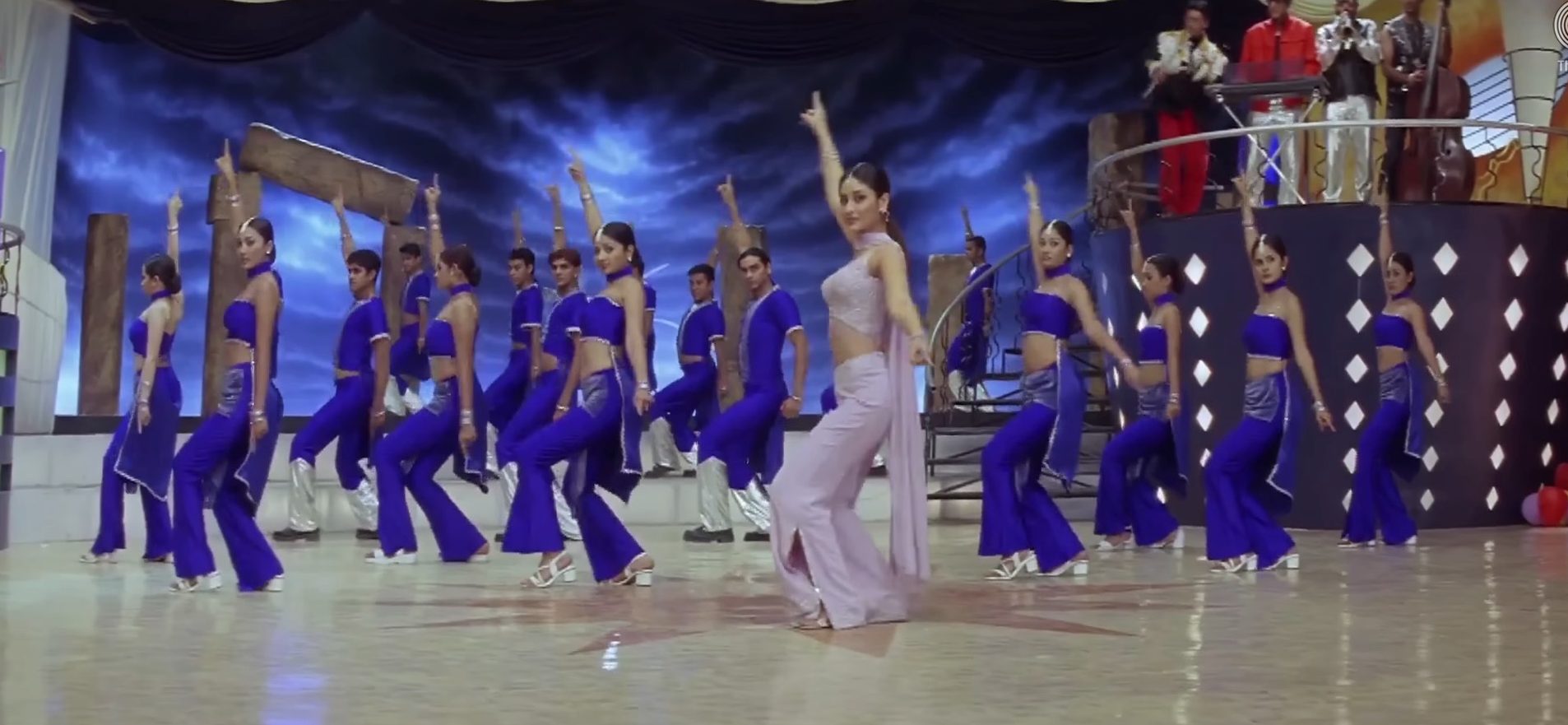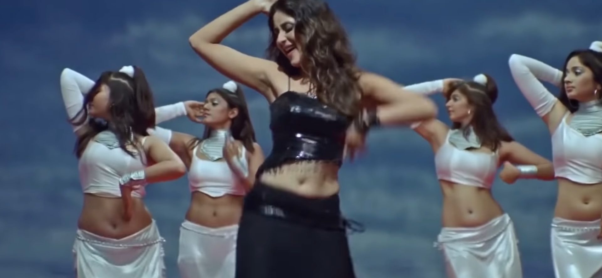 If you’re wondering how much influence Britney Spears had in the early 2000s, look no further than Kareena’s next outfit in this song which is a red spandex jumpsuit. It’s not a direct copy, but we’d say significantly inspired by the original in Oops I Did It Again. The jumpsuit features a high neck embellished with red sequins and zip front opening. The legs are flared and the sleeves are finished in pointed ends. The back is open with a series of straps across. Where’s the dupatta? Good question…