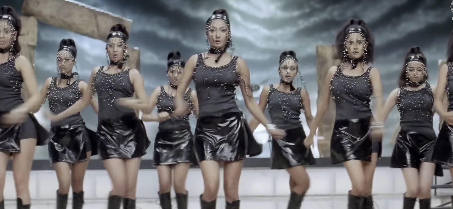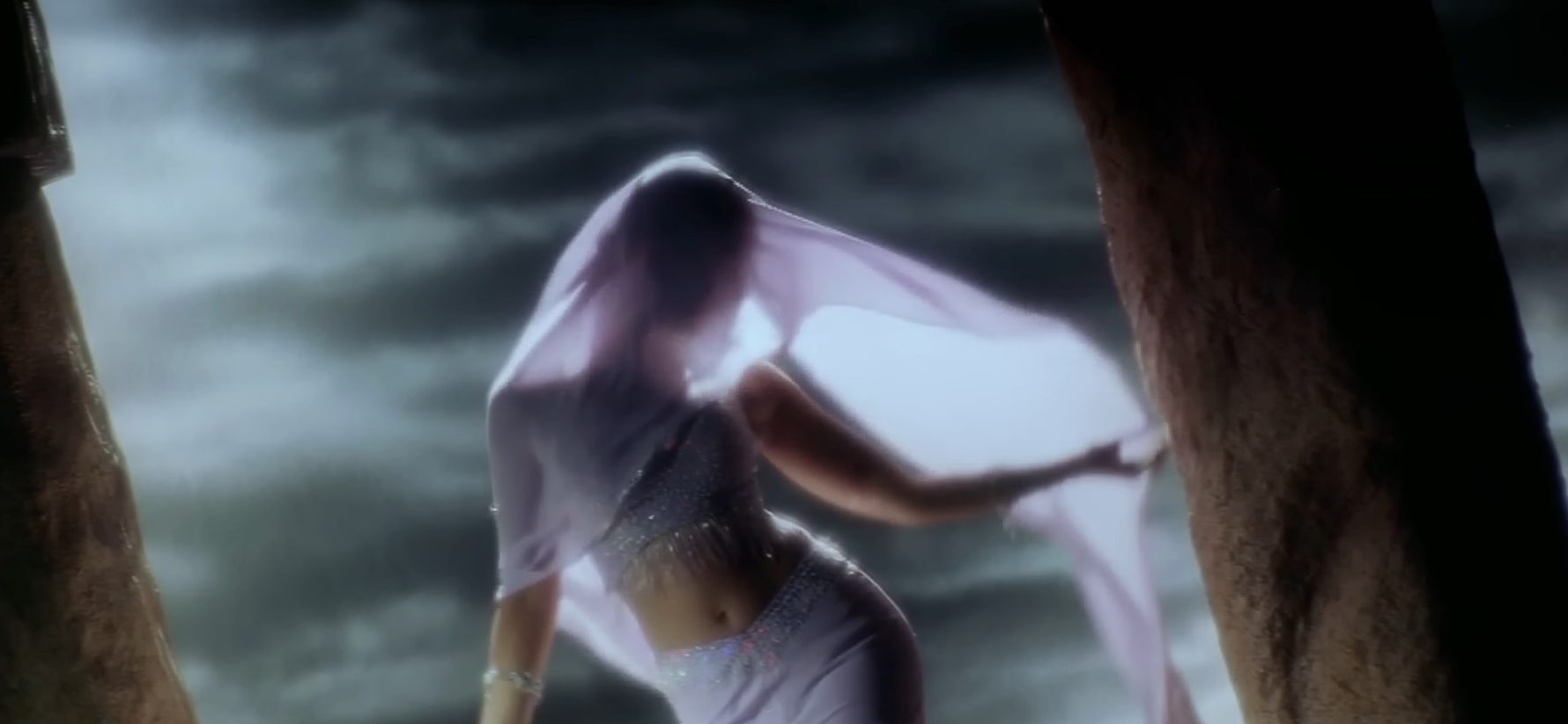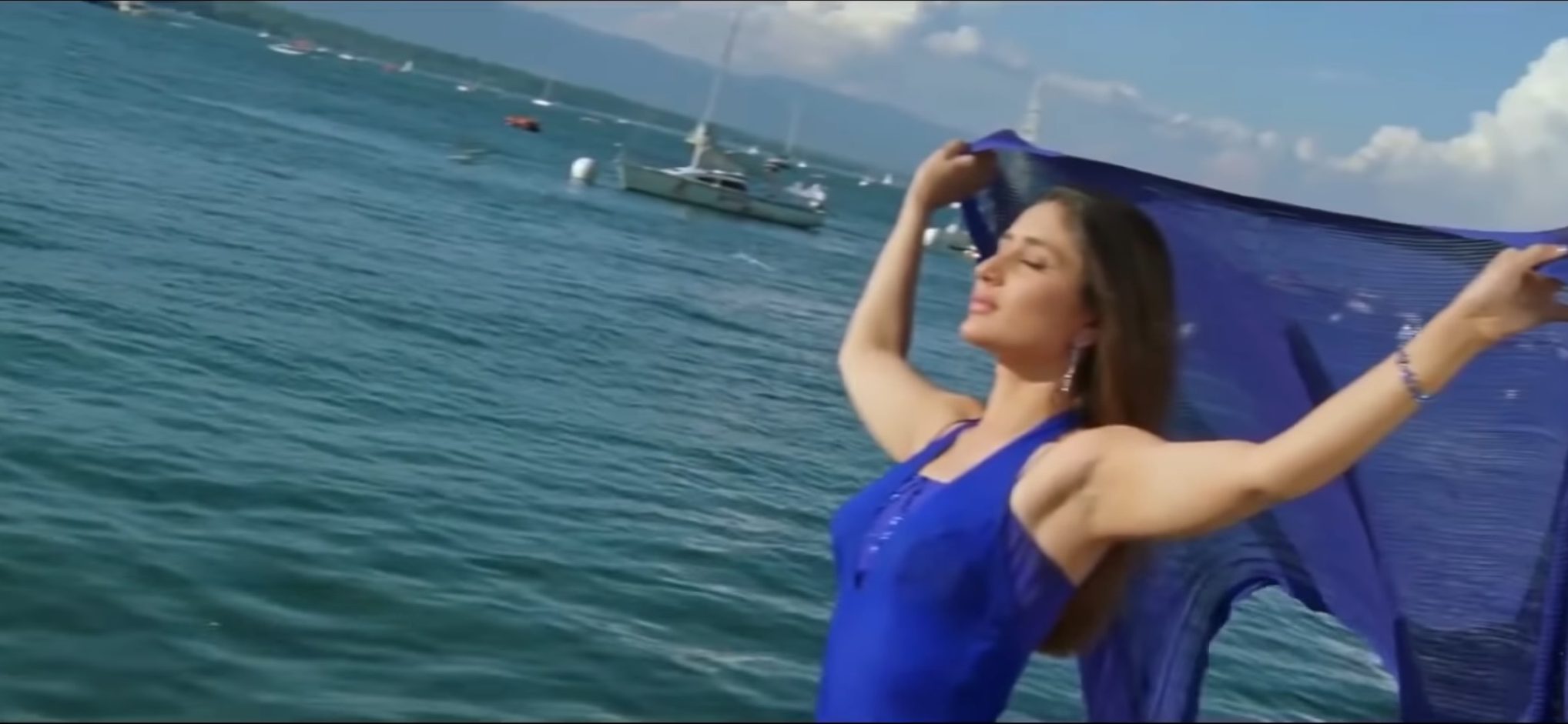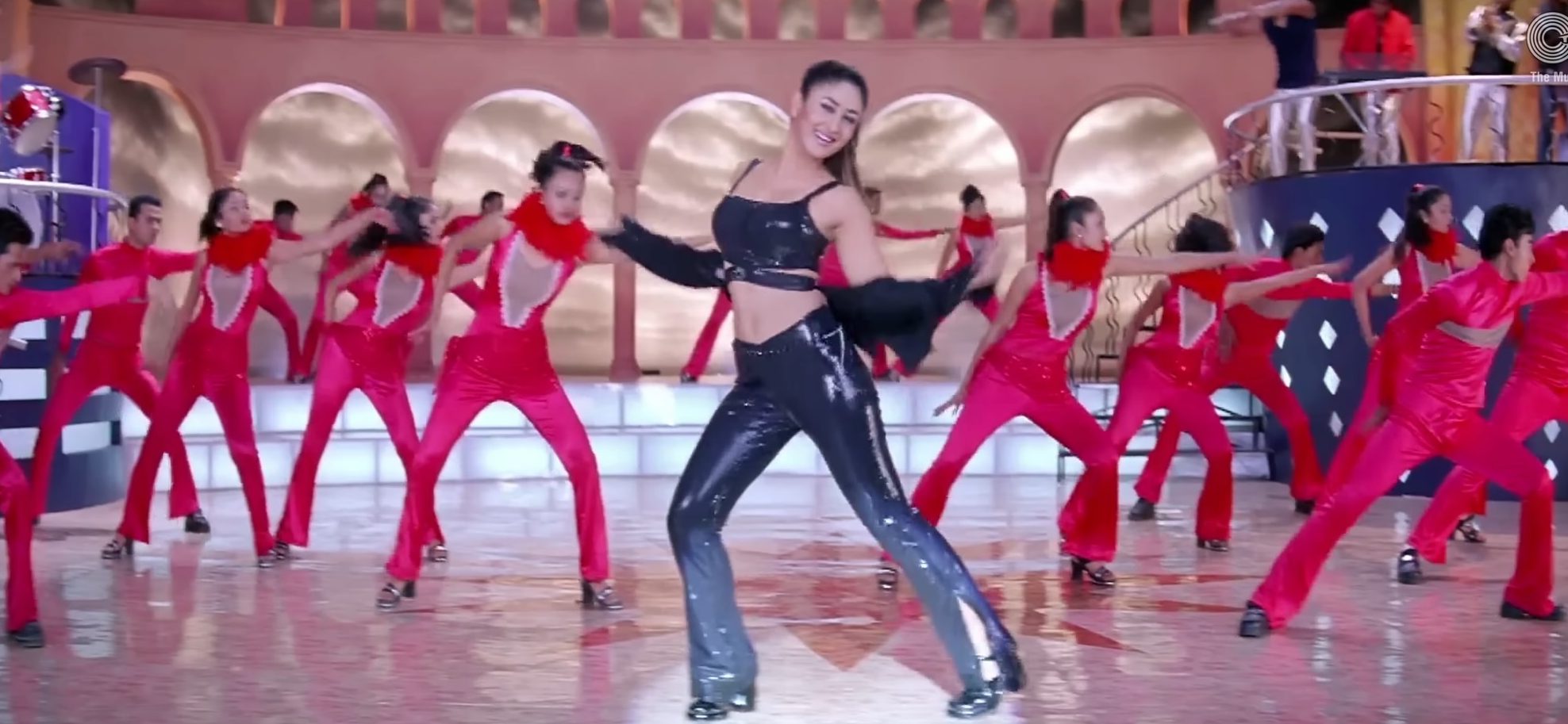 If you’re wondering how much influence Britney Spears had in the early 2000s, look no further than Kareena’s next outfit in this song which is a red spandex jumpsuit. It’s not a direct copy, but we’d say significantly inspired by the original in Oops I Did It Again. The jumpsuit features a high neck embellished with red sequins and zip front opening. The legs are flared and the sleeves are finished in pointed ends. The back is open with a series of straps across. Where’s the dupatta? Good question…
