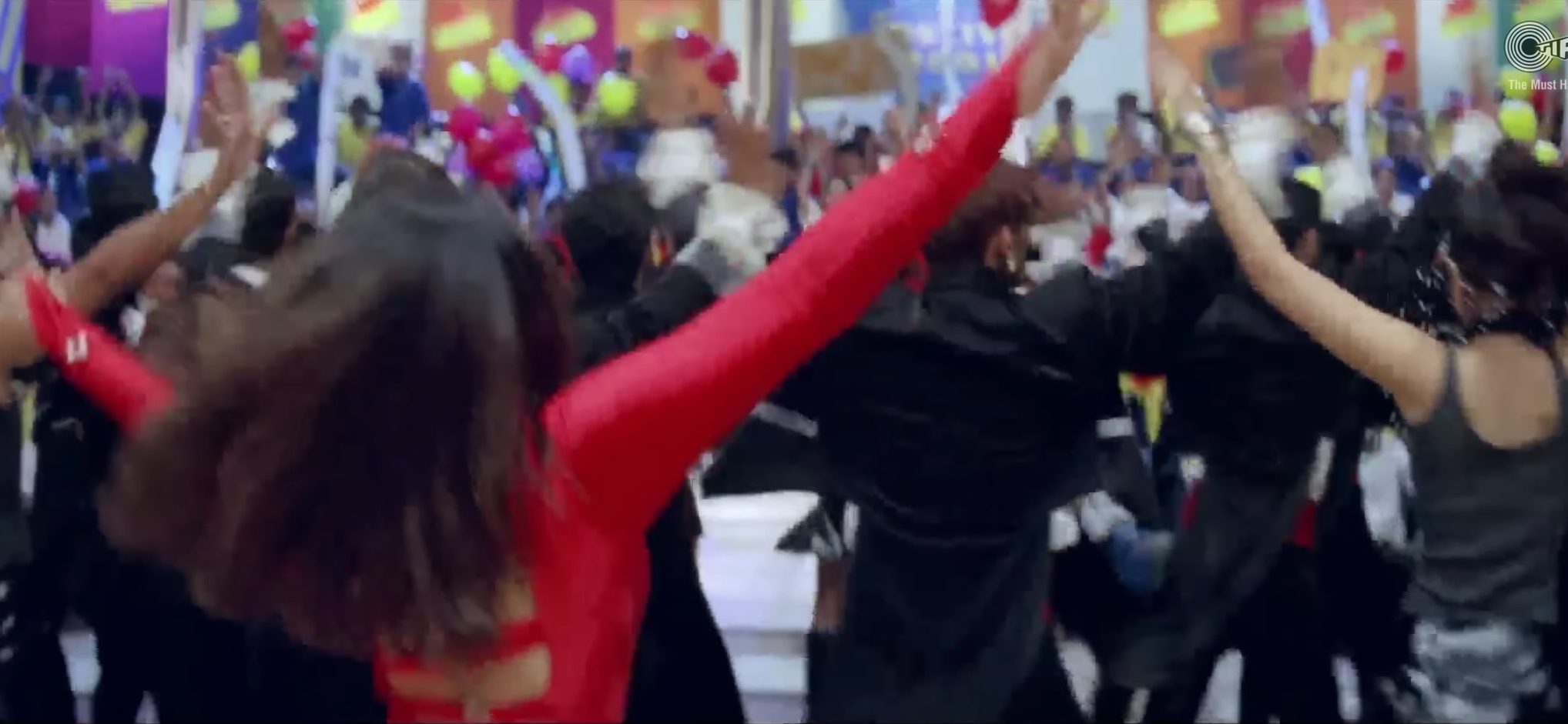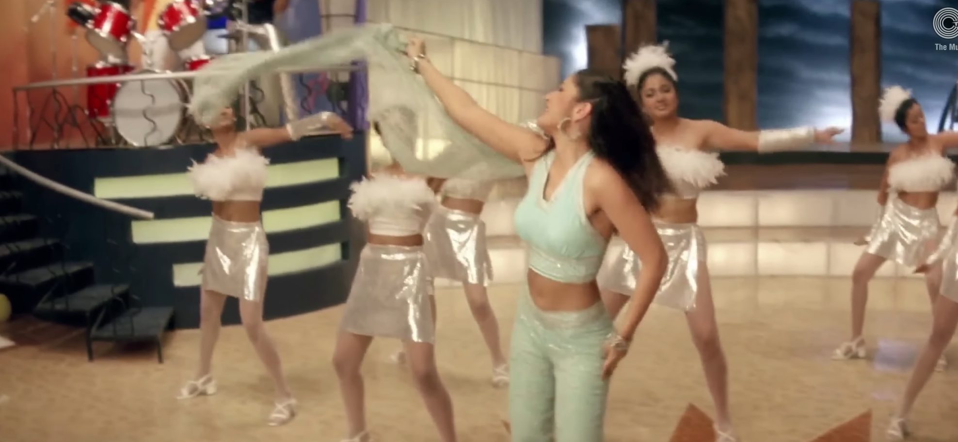 We round the song out with this mint and silver ensemble of – you guessed it – a crop top (this time a halter) with flared trousers. She finally found her dupatta though, so points for that!