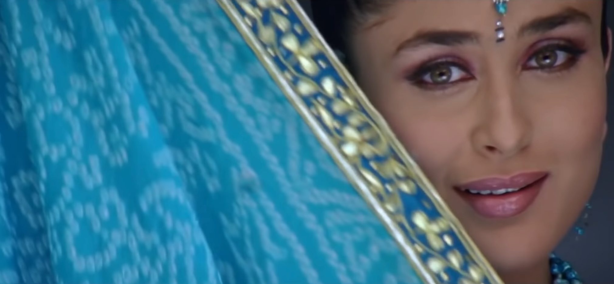 We then move into the most traditional look Kareena sports across both songs, with this village belle-esque wrap skirt and choli combo in a turqouise bandhani print embellished with pale gold gota work. There’s even briefly a dupatta with a darker blue and gold gota work border!
